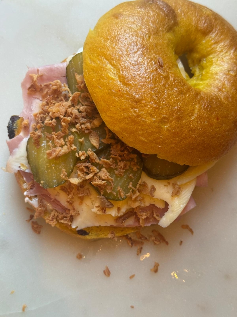 - Layer cooked ham and cheese: Ham first, then cheese. Let the cheese soften slightly from the warmth of the bagel.